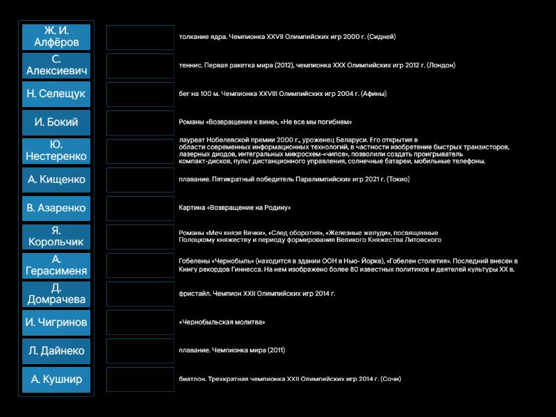 C. Алексиевич - «Чернобыльская молитва», И. Чигринов - Романы «Возвращение к вине», «Не все мы погибнем», Л. Дайнеко - Романы «Меч князя Вячки», «След оборотня», «Железные желуди», посвященные Полоцкому княжеству и периоду формирования Великого Княжества Литовского, Ю. Нестеренко - бег на 100 м. Чемпионка XXVIII Олимпийских игр 2004 г. (Афины), B. Азаренко - теннис. Первая ракетка мира (2012), чемпионка ХХХ Олимпийских игр 2012 г. (Лондон), A. Герасименя - плавание. Чемпионка мира (2011), Д. Домрачева - биатлон. Трехкратная чемпионка XXII Олимпийских игр 2014 г. (Сочи), A. Кушнир - фристайл. Чемпион XXII Олимпийских игр 2014 г., H. Селещук - Картина «Возвращение на Родину», A. Кищенко - Гобелены «Чернобыль» (находится в здании ООН в Нью- Йорке), «Гобелен столетия». Последний внесен в Книгу рекордов Гиннесса. На нем изображено более 80 известных политиков и деятелей культуры ХХ в., Ж. И. Алфёров - лауреат Нобелевской премии 2000 г., уроженец Беларуси. Его открытия в области современных информационных технологий, в частности изобретение быстрых транзисторов, лазерных диодов, интегральных микросхем-«чипов», позволили создать проигрыватель компакт-дисков, пульт дистанционного управления, солнечные батареи, мобильные телефоны., И. Бокий - плавание. Пятикратный победитель Паралимпийских игр 2021 г. (Токио), Я. Корольчик - толкание ядра. Чемпионка XXVII Олимпийских игр 2000 г. (Сидней),