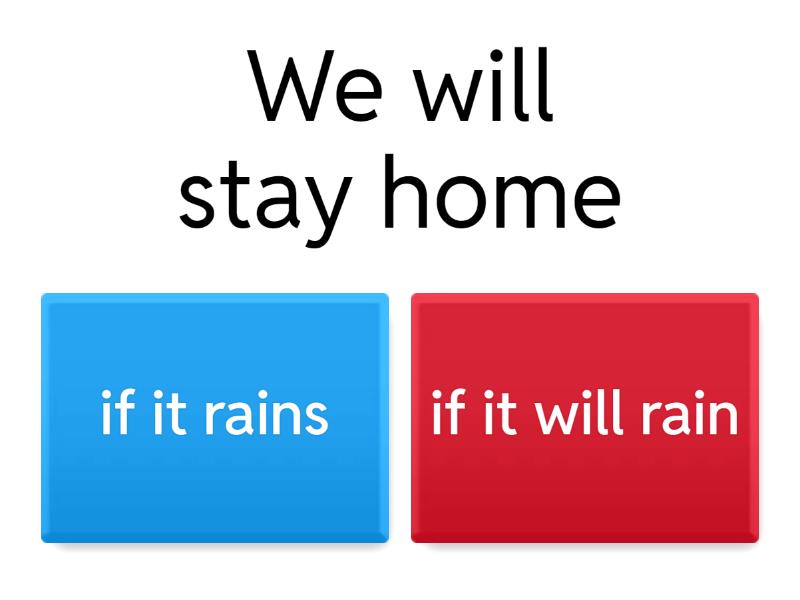 1) We will stay home a) if it rains b) if it will rain 2) She will pass the exam a) is she studies hard. b) if she will study hard. 3) We will catch the bus a) if you will hurry. b) if you hurry. 4) We will tell him a secret a) if we see him. b) if we will see him. 5) You will go out a) if you finish your homework. b) if you will finish your homework. 6) I will buy bread a) if I will have enough money. b) if I have enough money. 7) We will have a picnic a) if it is sunny. b) if it will be sunny. 8) I will see a doctor a) if I will feel sick. b) if I feel sick. 9) I will help you a) if I will have time b) if I have time 10) We will eat in a restaurant a) if we are hungry b) if we will be hungry