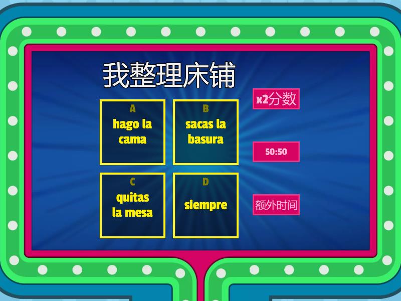 1) 我整理床铺 a) hago la cama b) sacas la basura c) quitas la mesa d) siempre 2) 你整理床铺 a) quito la mesa b) recoges la habitación c) siempre d) haces la cama 3) 我整理房间 a) hago la compra b) pones la mesa c) hago la cama d) recojo la habitación 4) 你整理房间 a) recoges la habitación b) haces la comida c) pongo la mesa d) hago la cama 5) 我做饭 a) hago la comida b) recoges la habitación c) sacas la basura d) haces la compra 6) 你做饭 a) nunca b) haces la comida c) pones la mesa d) pongo la mesa 7) 我购物 a) hago la compra b) haces la cama c) quito la mesa d) haces la compra 8) 你购物 a) recojo la habitación b) haces la compra c) recoges la habitación d) friego los platos 9) 我布置餐桌 a) normalmente b) hago la comida c) quito la mesa d) pongo la mesa 10) 你布置餐桌 a) hago la compra b) sacas la basura c) a menudo d) pones la mesa 11) 我收拾餐桌 a) quito la mesa b) hago la compra c) recojo la habitación d) saco la basura 12) 你收拾餐桌 a) quitas la mesa b) normalmente c) recoges la habitación d) friegas los platos 13) 我洗碗 a) friego los platos b) hago la compra c) pongo la mesa d) haces la cama 14) 你洗碗 a) friegas los platos b) nunca c) quitas la mesa d) siempre 15) 我扔垃圾 a) friego los platos b) recojo la habitación c) saco la basura d) quitas la mesa 16) 你扔垃圾 a) quito la mesa b) friego los platos c) recojo la habitación d) sacas la basura 17) 总是 a) siempre b) recoges la habitación c) friegas los platos d) sacas la basura 18) 通常 a) quito la mesa b) sacas la basura c) pongo la mesa d) normalmente 19) 经常 a) normalmente b) nunca c) quito la mesa d) a menudo 20) 从不 a) pones la mesa b) nunca c) haces la compra d) a menudo
