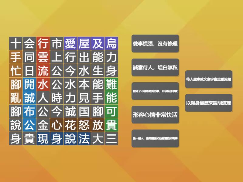 難能可貴 - 做到了不容易做到的事,所以特別珍貴, 愛屋及烏 - 愛一個人,連帶關愛和他有關的所有事, 行雲流水 - 待人處事或文章字畫生動流暢, 開誠布公 - 誠意待人,坦白無私, 心花怒放 - 形容心情非常快活, 現身說法 - 以親身經歷來說明道理, 手忙腳亂 - 做事慌張,沒有條理,