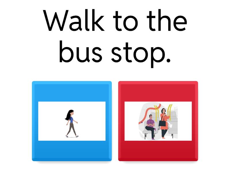 1) Walk to the bus stop. a) b) 2) Wait for the bus. a) b) 3) Get on the bus. a) b) 4) Pay with your bus card. a) b) 5) Ride on the bus. a) b) 6) Push the stop button. a) b) 7) Get off the bus. a) b)