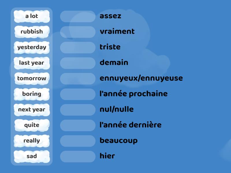 next year - l'année prochaine, last year - l'année dernière, quite - assez, a lot - beaucoup, tomorrow - demain, yesterday - hier, sad - triste, boring - ennuyeux/ennuyeuse, rubbish - nul/nulle, really - vraiment,