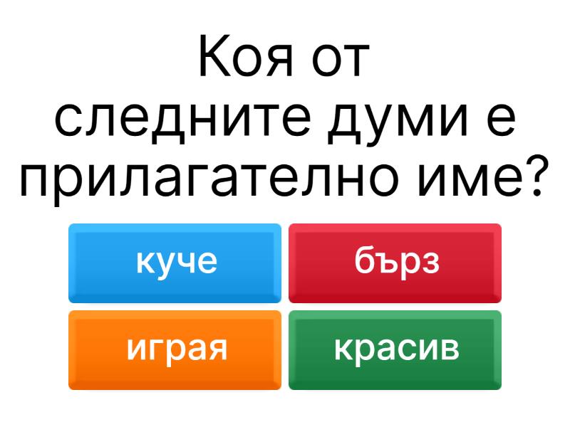 1) Коя от следните думи е прилагателно име? a) куче b) бърз c) играя d) красив 2) Какво е противоположно на думата ''студен''? a) топъл b) тежък c) мек d) лек 3) Коя от следните думи е глагол? a) щастлив b) тичам c) хубав d) книга 4) Как се казва съществителното, което означава ''животно , което може да лети''? a) котка b) куче c) птица d) риба 5) Кой от следните глаголи означава ''говоря''? a) пея b) мълча c) тичам d) разказвам