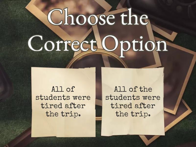 1) Choose the Correct Option a) All of students were tired after the trip. b) All of the students were tired after the trip. 2) Choose the Correct Option a) Both cats were sleeping on the sofa. b) Both of the cats were sleeping on the sofa. 3) Choose the Correct Option a) Both of friends came to the party. b) Both of my friends came to the party. 4) Choose the Correct Option a) All children like playing in the park. b) All of the children like playing in the park. 5) Choose the Correct Option a) All the teachers were at the meeting. b) All of the teachers were at the meeting.
