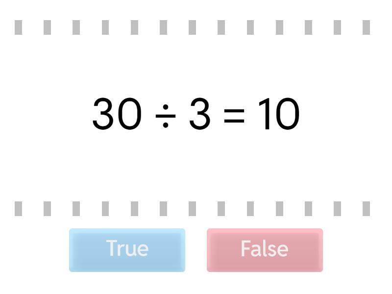 True: 30 ÷ 3 = 10, 12 ÷ 2 = 6, 72 ÷ 8 = 9, 33 ÷ 3 = 11, 56 ÷ 8 = 7, False: 100 ÷ 10 = 5, 4 ÷ 4 = 8, 15 ÷ 5 = 12, 10 ÷ 5 = 4, 40 ÷ 10 = 2,