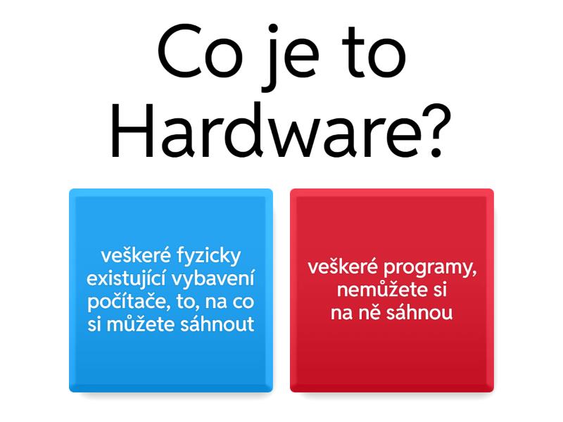 1) Co je to Hardware? a) veškeré fyzicky existující vybavení počítače, to, na co si můžete sáhnout b) veškeré programy, nemůžete si na ně sáhnou 2) Co dělá grafická karta? a) můžeme díky ní poslouchat zvuk b) díky ní se můžeme připojit k internetu c) vytváří grafický výstup na monitoru 3) Které z možností je operační systém? a) Instagram b) Windows c) Hardware  d) Chat 4) Kdo nebo co je hacker? a) člověk, který se nabourává do počítačů b) zvíře , které žije v asii c) sociální síť d) písnička 5) Která z uvedených možností není umělá iteligence?  a) ChatGPT b) Google bard c) Anthropic claude d) Duolingo 6) Co je informatika a) Jídlo b) věda zabývající se počítači c) druh hodinek d) značka oblečení