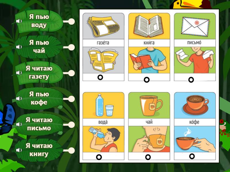 Я читаю газету, Я читаю книгу, Я читаю письмо, Я пью воду, Я пью чай, Я пью кофе.