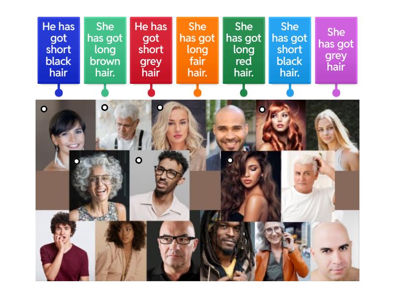 She has got short black hair., He has got short grey hair , She has got long fair hair., She has got long red hair., She has got grey hair, He has got short black hair , She has got long brown hair..