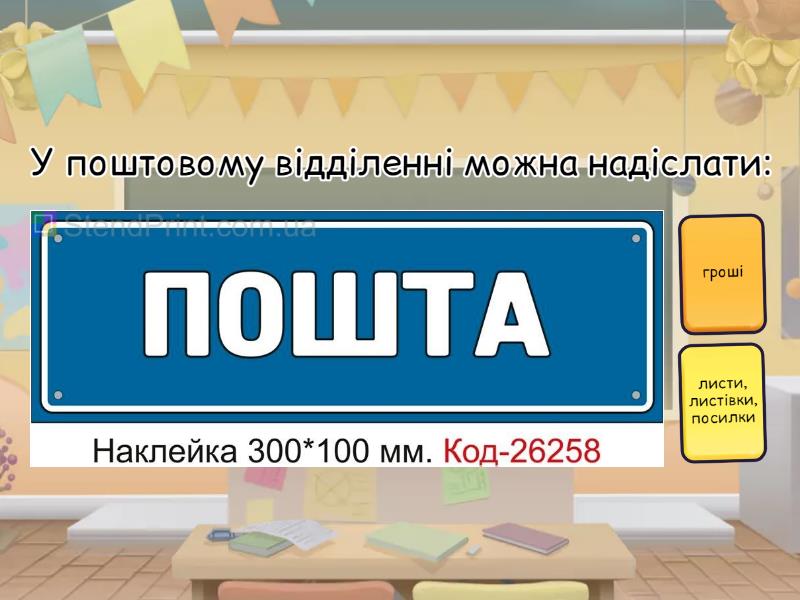 1) У поштовому відділенні можна надіслати: a) гроші b) листи, листівки, посилки 2) Найпоширеніший вид відправлень, може бути звичайним або рекомендованим: a) листи b) листівки 3) Великі пакунки, що містять різні речі, доставляються на поштове відділення: a) посилки b) листівки 4) Експрес - відправлення це: a) швидка доставка документів або товарів b) поштове відправлення, яке може містити друковану продукцію 5) Прибирання житла поділяється на: a) щоденне b) щоденне, щотижневе, генеральне 6) Речовини, за допомогою яких можна зробити речі та оселю чистими: a) миючі засоби b) інструменти 7) До інструментів приберання житла належить: a) засіб для миття підлоги b) пилесос, віник, відро 8) Що робимо с продуктами перед приготуванням? a) чистимо, миємо, нарізаємо b) нарізаємо, миємо, чистимо 9) До нешвидкопсувних продуктів належать: a) Борошно і сухі вироби з борошна, цукор, чай, сіль b) молочні продукти 10) До швидкопсувних продуктів належать: a) молочні продукти, м'ясні вироби b) консерви в банках 11) Електроприлад, призначений для охолодження, заморожування і зберігання швидкопсувних продуктів: a) мікрохвильова піч b) холодильник 12) Зберігати продукти в теплі, без холодильника... a) небезпечно для життя b) безпечно для життя 13) Купувати і їсти продукти у яких закінчився термін зберігання: a) небезпечно для життя b) безпечно для життя 14) Установа для надання стаціонарної медичної допомоги, до структури якої входять поліклініки. a) Диспансер b) Лікарня 15) установа охорони здоров'я, яка забезпечує населення, лікувально-профілактичні установи ліками, предметами санітарії, гігієни, догляду за хворими, перев'язувальним матеріалом, дезінфекційними засобами a) аптека b) лікарня 16) В аптеці зберігають, готують і відпускають лікарські засоби населенню за рецептами і без них a) так b) ні 17) До автомобільного транспорту належить: a) автобус, мотоцикл b) літак, корабель 18) До водного транспорту належить: a) літак, автомобіль b) корабель, яхта