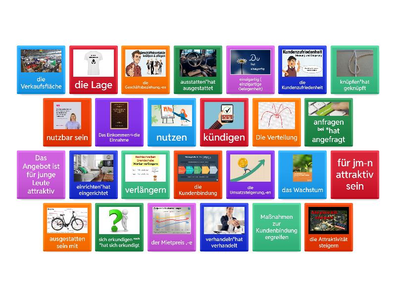 anfragen bei *hat angefragt - запра́шивать (что-л. у кого́-л.), sich erkundigen nach *hat sich erkundigt - спра́шивать (кого́-л. о ком-л./чём-л.) - осведомля́ться, einrichten*hat eingerichtet - обору́довать (что-л.), verhandeln*hat verhandelt - догова́риваться (с кем-л. о чём-л.) - вести́ перегово́ры, ausstatten*hat ausgestattet - оснащать,оборудовать, ausgestatten sein mit - быть оснащенным, verlängern - продлить, kündigen - расторгнуть, nutzen - использовать, nutzbar sein - быть пригодным для использования, die Lage - местоположение, die Attraktivität steigern - повышать привлекательность ( бренда,продукта), die Kundenbindung - удержание клиентов, Maßnahmen zur Kundenbindung ergreifen - предпринимать меры по удержанию клиентов, für jm-n attraktiv sein - быть привлекательным для кого то, Das Angebot ist für junge Leute attraktiv - предложение для молодых людей привлекательно, einzigartig ( einzigartige Gelegenheit) - уникальный(уникальная возможность, Das Einkommen➯die Einnahme - доход, der Mietpreis ,-e - арендная плата, die Geschäftsbeziehung,-en - деловые отношения, die Verkaufsfläche - торговая площадь, das Wachstum - рост, die Umsatzsteigerung,-en - рост продаж, die Kundenzufriedenheit - удовлетворенность клиентов, Die Verteilung - распределение, knüpfen*hat geknüpft - завя́зывать (что-л.),связывать,
