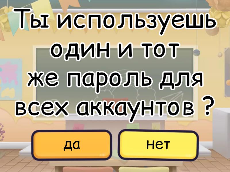 1) Ты используешь один и тот же пароль для всех аккаунтов ? a) да b) нет 2) Ты переходишь по ссылкам из незнакомых сообщений ? a) да b) нет 3) Ты делишься геолокацией в соцсетях с незнакомцами ? a) да b) нет 4) Ты обновляешь приложения и антивирусы ? a) да b) нет 5) Ты жалуешься на кибербуллинг, если тебя оскорбляют в сети ? a) да b) нет