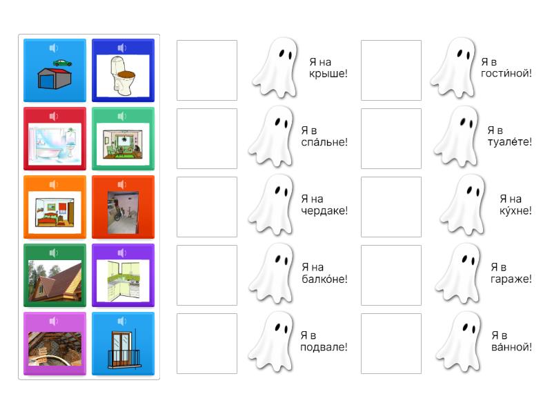 Я в спа́льне!, Я на балко́не!, Я в гости́ной!, Я в гараже!, Я на ку́хне!, Я на крыше!, Я на чердаке!, Я в ва́нной!, Я в туале́те!, Я в подвале!,