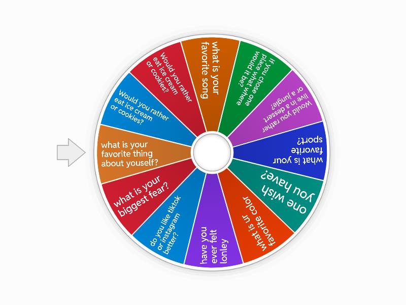 1) Would you rather eat ice cream or cookies? 2) Would you rather eat ice cream or cookies? 3) what is your favorite song 4) If you chose one place what where would it be? 5) Would you rather live in a dessert or a jungle? 6) what is your favorite sport? 7) one wish you have? 8) what is ur favorite color 9) have you ever felt lonley 10) do you like tiktok or instagram better? 11) what is your biggest fear? 12) what is your favorite thing about youself?