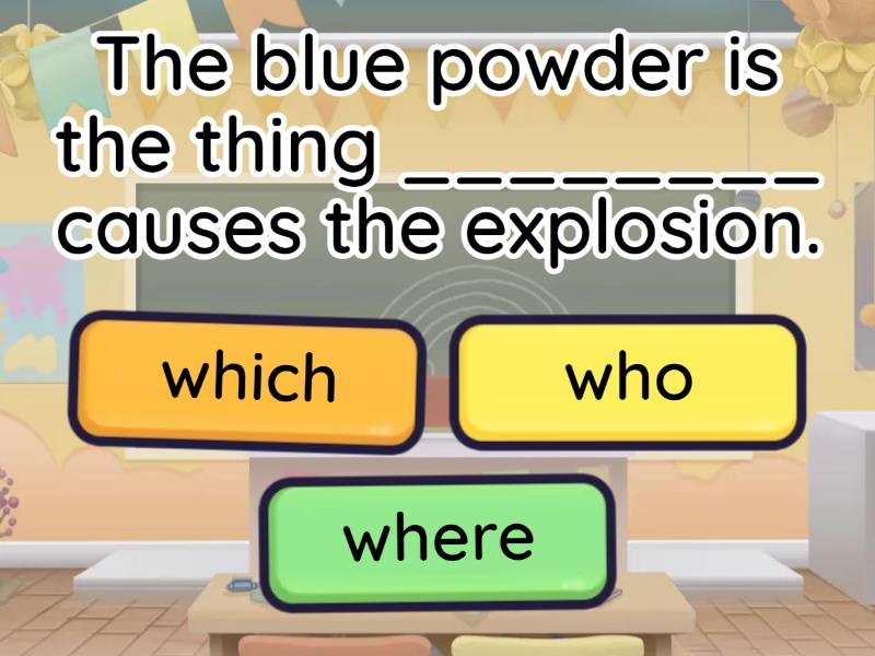 1) The blue powder is the thing ________ causes the explosion. a) which b) who c) where 2) Mr Davis is the man ________ teaches them Science. a) which b) who c) where 3) Phoebe and Alex read the instructions ________ Mr Davis gave them. a) which b) who c) where 4) The shelf is the place ________ the goggles hit the jar. a) which b) who c) where 5) Patrick is the boy ________ caused the accident. a) which b) who c) where 6) The Science lab is the room ________ the accident happens. a) which b) who c) where