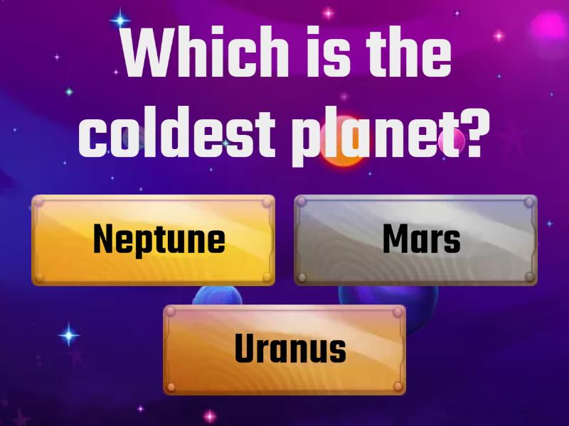 1) Which is the coldest planet?  a) Neptune b) Mars  c) Uranus 2) Whis is the hottest planet? a) Mars b) Venus c) Neptune 3) How many planets are there in the solar system? a) 7 b) 8 c) 9 4) What planet is covered 70% by water? a) Earth b) Mars c) Neptune 5) The biggest planet is... a) Earth b) Jupiter c) Saturn 6) The smallest planet is.... a) Mercury b) Mars c) Venus 7) Which planet is this? a) Jupiter b) Saturn c) Venus 8) Which planet is this? a) Mars b) Venus c) Earth