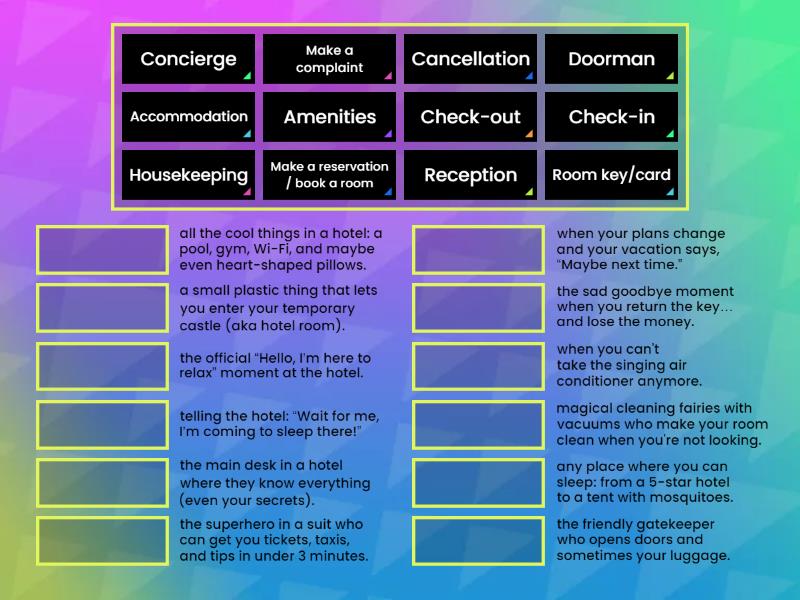 Accommodation - any place where you can sleep: from a 5-star hotel to a tent with mosquitoes., Cancellation - when your plans change and your vacation says, “Maybe next time.”, Make a complaint - when you can't take the singing air conditioner anymore., Doorman - the friendly gatekeeper who opens doors and sometimes your luggage., Check-in - the official “Hello, I’m here to relax” moment at the hotel., Check-out - the sad goodbye moment when you return the key… and lose the money., Concierge - the superhero in a suit who can get you tickets, taxis, and tips in under 3 minutes., Amenities - all the cool things in a hotel: a pool, gym, Wi-Fi, and maybe even heart-shaped pillows., Make a reservation / book a room - telling the hotel: “Wait for me, I’m coming to sleep there!”, Room key/card - a small plastic thing that lets you enter your temporary castle (aka hotel room)., Housekeeping - magical cleaning fairies with vacuums who make your room clean when you're not looking., Reception - the main desk in a hotel where they know everything (even your secrets).,