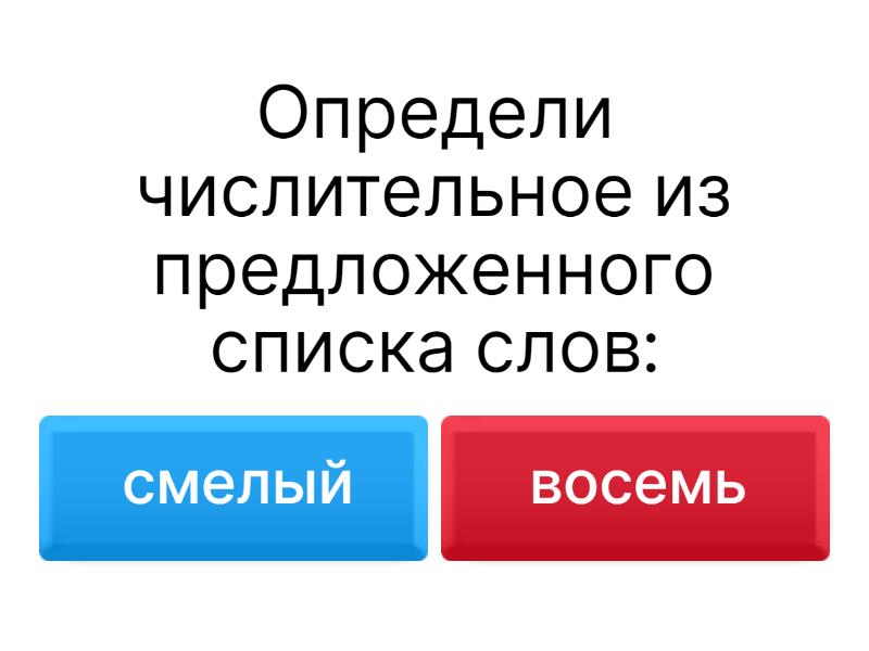 1) Определи числительное из предложенного списка  слов: a) смелый  b)   восемь  2) К имени числительному можно поставить вопрос: a) Какой(по счету)?  b) Б) Что делать? 3) Имя числительное  - это часть речи. Имена числительные обозначают: a) признак предмета  b)   количество предметов 4) Выбери предложение, в котором имеется имя числительное: a) Вторник – это день второй.  b) Жили – были дед да баба.