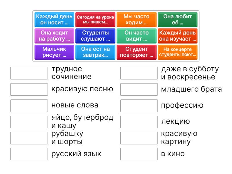 На концерте студенты поют... - красивую песню , Сегодня на уроке мы пишем... - трудное сочинение, Она ест на завтрак... - яйцо, бутерброд и кашу, Студент повторяет ... - новые слова, Мальчик рисует ... - красивую картину, Она любит её ... - профессию, Студенты слушают ... - лекцию , Каждый день она изучает ... - русский язык, Мы часто ходим ... - в кино, Он часто видит ... - младшего брата, Каждый день он носит ... - рубашку и шорты, Она ходит на работу ... - даже в субботу и воскресенье ,