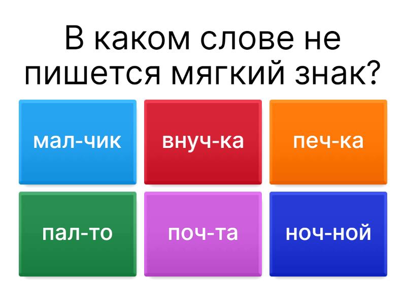 1) В каком слове не пишется мягкий знак? a) мал-чик b) внуч-ка c) печ-ка d) пал-то e) поч-та f) ноч-ной