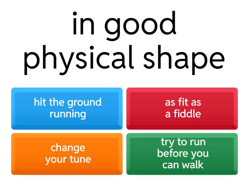 1) in good physical shape a) hit the ground running b) as fit as a fiddle c) change your tune d) try to run before you can walk 2) to boast/brag about your own achievements a) blow your own trumpet b) run a mile c) play it by ear d) face the music 3) change opinion/attitude a) play it by ear b) run off my feet c) change your tune d) as fit as a fiddle 4) to accept responsibility for something you have done a) get off to a running start  b) play it by ear c) face the music d) hit the ground running 5) to complain about (something) in a way that is excessive or unnecessary a) blow your own trumpet b) get sth up and running again c) make a song and dance about it d) try to run before you can walk 6) improvise a) play it by ear b) get sth up and running again c) change your tune d) hit the ground running 7) it reminds you of something a) change your tune b) run a mile c) ring a bell d) hit the ground running 8) Starting (something) with an initial advantage, benefit, or favorable position a) get sth up and running again b) run the risk of+ing c) play it by ear d) get off to a running start  9) to bring a system, machine, or process back into normal operation after it has been malfunctioning or stopped a) get sth up and running again b) make a song and dance about it c) run off my feet d) hit the ground running 10) to start a new activity/situation with enthusiasm, energy, immediately and successfully a) hit the ground running b) ring a bell c) running around in circles d) run off my feet 11) a situation regarded as frightening or alarming. a) run a mile b) play it by ear c) blow your own trumpet d) run off my feet 12) to be very busy a) run the risk of+ing b) ring a bell c) change your tune d) run off my feet 13) there's a chance that something undesirable could occur as a consequence a) change your tune b) get off to a running start  c) run the risk of+ing d) running around in circles 14) to keep doing or talking about the same thing without achieving anything a) run a mile b) running around in circles c) blow your own trumpet d) run the risk of+ing 15) attempt to do sth difficult before you're sure you can do sth simpler a) try to run before you can walk b) hit the ground running c) face the music d) running around in circles