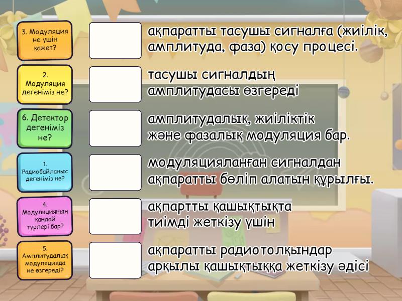 1. Радиобайланыс дегеніміз не? - ақпаратты радиотолқындар арқылы қашықтыққа жеткізу әдісі , 2. Модуляция дегеніміз не? - ақпаратты тасушы сигналға (жиілік, амплитуда, фаза) қосу процесі., 3. Модуляция не үшін қажет? - ақпартты қашықтықта тиімді жеткізу үшін , 4. Модуляцияның қандай түрлері бар? - амплитудалық, жиіліктік және фазалық модуляция бар., 5. Амплитудалық модуляцияда не өзгереді? - тасушы сигналдың амплитудасы өзгереді, 6. Детектор дегеніміз не? - модуляцияланған сигналдан ақпаратты бөліп алатын құрылғы.,
