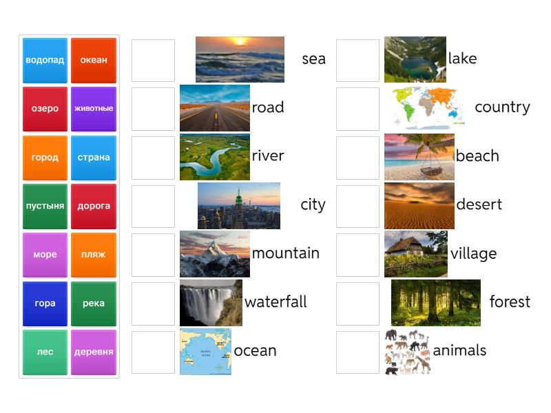 река - river, озеро - lake, океан - ocean, гора - mountain, лес - forest, море - sea, животные - animals, пустыня - desert, город - city, страна - country, водопад - waterfall, дорога - road, деревня - village, пляж - beach,