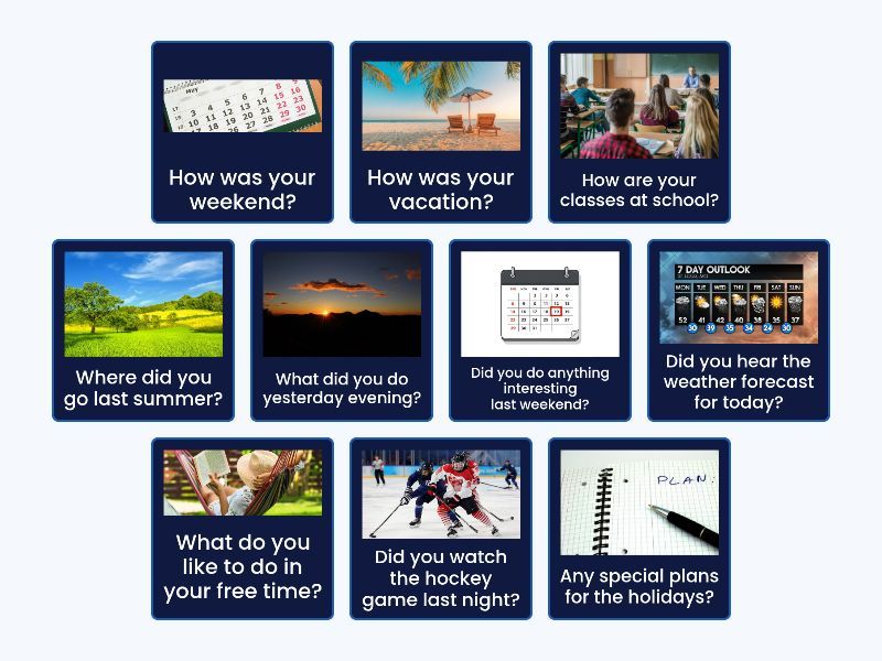 How was your weekend? - My weekend was good. I went swimming ., How was your vacation? - It was great. We had good weather the whole time., How are your classes at school? - They are going well. I really like my teachers., Where did you go last summer? - I went back home to Colombia., What did you do yesterday evening? - I watched a movie with my wife and kids., Did you do anything interesting last weekend? - Yes, I went to a museum., Did you hear the weather forecast for today? - Yes, it's supposed to rain later., What do you like to do in your free time? - I go for walks in the local park., Did you watch the hockey game last night? - Yes, our team is doing really well. Go, Oilers!, Any special plans for the holidays? - Yes, we are going to Jasper for two days.,