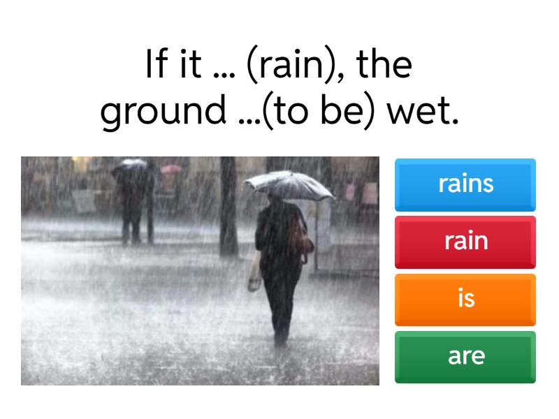1) If it ... (rain), the ground ...(to be) wet. a) rains b) rain c) is d) are 2) The river ... (freeze) if it ... (to be) cold. a) freeze b) freezes c) is d) does 3) The ground ... ( not dry out) if you ... (water) plants twice a week. a) doesn`t dry out b) don`t dry out c) waters d) water 4) If you ... (heat) water, it ... (boil). a) heat b) heats c) boil d) boils 5) If you ... (touch) a hot kettle, you ... (burn) your hand. a) touch b) touches c) burn d) burns 6) If you ... (mix) red and yellow, you ... (get) orange a) mixes b) mix c) gets d) get 7) If he ... ( not water) this plant, it ... (die). a) don`t water b) doesn`t water c) dies d) die 8) Ice ... (melt) if you ... (hold) it in your hand. a) melt b) melts c) hold d) holds 9) The ground ... (get) wet if it ...(rain). a) gets b) get c) rain d) rains 10) Ice-cream ... (melt) if you ... (heat) it. a) melt b) melts c) heat d) heats 11) If you ... (mix) blue and yellow, you ... (get) green.  a) mix b) mixes c) gets d) get 12) If Sue ... (not wear) a cap, he ... (get) sunstroke. a) don`t wear b) doesn`t wear c) gets d) get