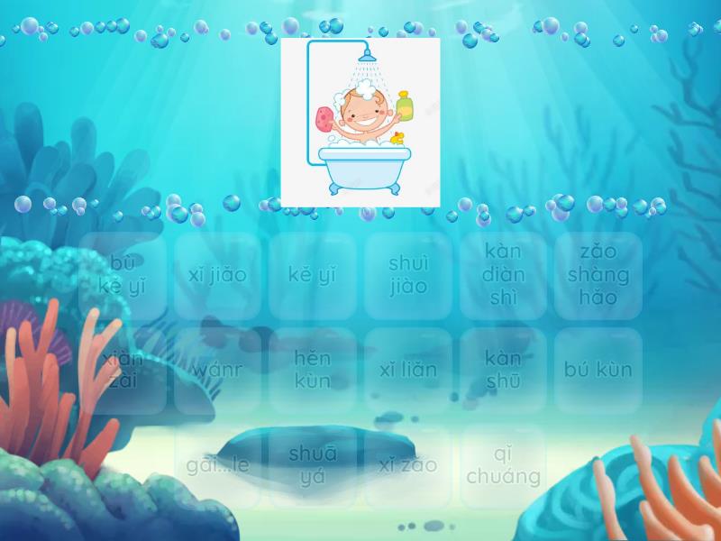 xǐ zǎo, xǐ liǎn, xǐ jiǎo, shuā yá, shuì jiào, wánr - play, kàn diàn shì, kàn shū, kě yǐ  - Can/May, bù kě yǐ  - No, gāi...le - It's time to..., qǐ chuáng - get up, hěn kùn - very sleepy, xiàn zài, bú kùn, zǎo shàng hǎo,
