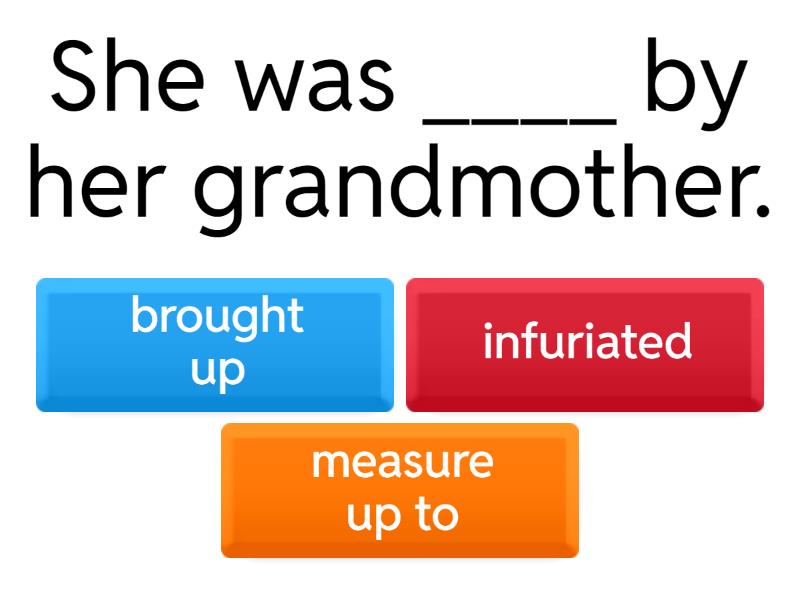 1) She was ____ by her grandmother. a) brought up b) infuriated c) measure up to 2) Her ___ behavior really gets on my nerves. a) high-achiever b) childish c) inferior 3) It's rare for teenagers and parents to ____ on everything. a) numb b) measure up to c) see eye to eye 4) You can voice your opinion but don`t ask ___ questions. a) boast b) childish c) show off 5) Such a ____ plan is bound to fail. a) appealing b) inseperable c) childish 6) Dad just can't bear to be ___. a) fall head-over-heels b) minimise risks c) contradicted 7) The rival will not_____without a fight. a) back down b) contEnt c) discourage from 8) I was so ____ about forgetting her birthday it just slipped my mind! a) adventurous b) appealing c) apologetic 9) If you're both going to lie, at least stick to the same story and don't ____ each other! a) trusting b) contradict c) hustle 10) It was ___ of her to postp a) sensible b) inseperable c) infinity 11) He spoke in an ____ tone, beacuse he was sorry. a) outgoing b) apologetic c) appealing 12) Both sides have refused to____. a) back down b) blend into one c) fall head-over-heels 13) It is hoped that a ____ will be reached in today's talks. a) a teen curfew b) compromise c) dispute 14) I'm a complete____ in the kitchen. a) run-wild b) high-achiever c) control freak