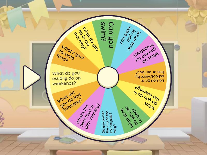 1) What’s your favorite food? 2) What do you do in the morning? 3) Can you swim? 4) What time do you wake up? 5) What do you eat for breakfast? 6) Do you go to school/work by bus or on foot? 7) What do you do in the evening? 8) What time do you go to bed? 9) Do you prefer the city or the countryside? Why? 10) What’s the best food in your country? 11) What did you do last Saturday? 12) What do you usually do on weekends?