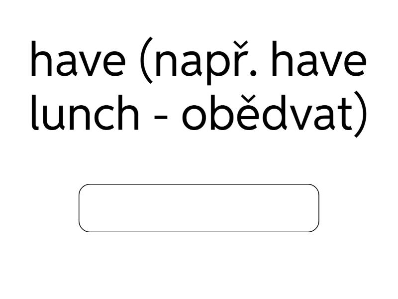 wear (nosit na sobě), learn (učit se), work (pracovat), play (hrát), get up (vstát z postele), sit (sedět), swim (plavat), pet (hladit, mazlit), walk (jít pěšky, venčit), lie (ležet), write (psát), eat (jíst), make (udělat, vyrobit), share (sdílet), do (dělat), go (jít), die (zemřít), have (např. have lunch - obědvat), run (běžet), set (nastavit, prostřít), tidy (uklidit).