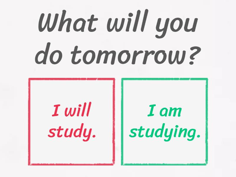 1) What will you do tomorrow? a) I will study. b) I am studying. 2) She is going to visit her grandma on Friday. a) A plan b) A prediction 3) They are playing soccer at 5 PM. a) An arrangement b) An offer 4) I think she will be a famous writer. a) prediction base on personal opinion b) plan 5) I'm visiting my doctor next monday. a) An arrangement b) A prediction 6) I will help you with that. a) An offer b) A plan