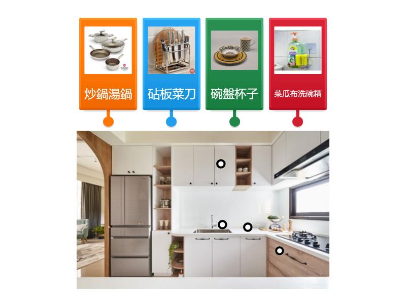 砧板菜刀, 菜瓜布洗碗精, 炒鍋湯鍋, 碗盤杯子.