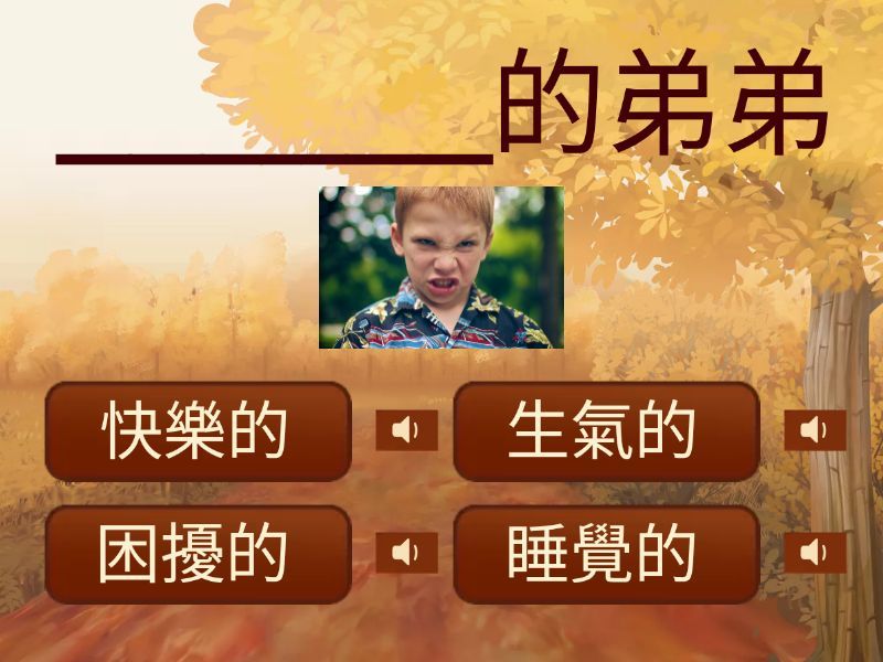 1) ______的弟弟 a) 快樂的 b) 生氣的 c) 困擾的 d) 睡覺的 2) ______的小朋友 a) 快樂的 b) 開心的 c) 哭泣的 d) 生氣的 3) _____的爸爸 a) 生氣的 b) 哭泣的 c) 疲倦的 d) 開心的