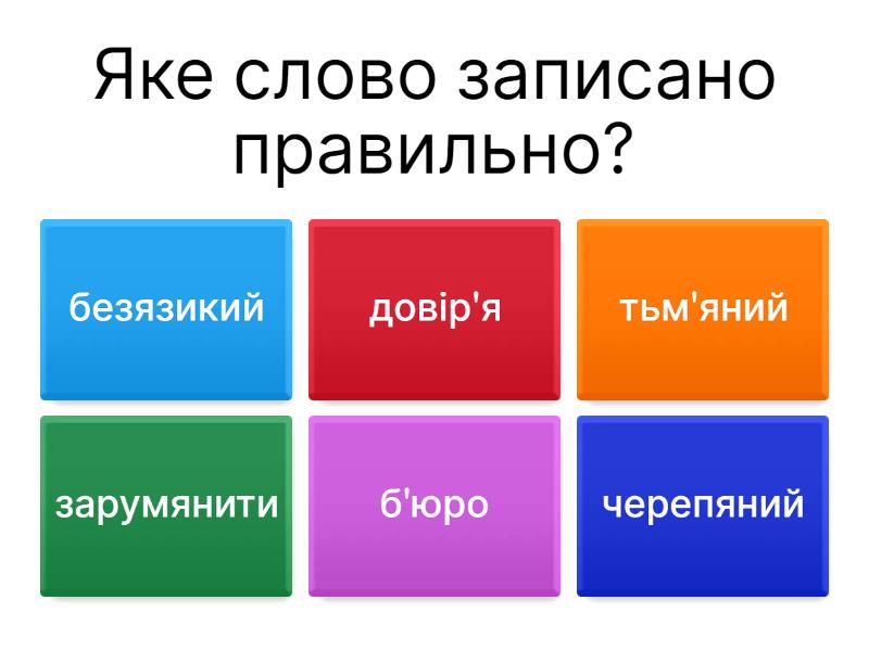 1) Яке слово записано правильно? a) безязикий b) довір'я c) тьм'яний d) зарумянити e) б'юро f) черепяний 2) У якому слові відбулося спрощення? a) чесний b) шістнадцять c) баластний d) хвастливий e) випускний f) форпостний 3) Знайдіть правильно записане слово a) нянчити b) сільский c) тоньший d) сенйора e) квітоньці f) велетеньський 4) Знайдіть неправильно записане слово a) тернопільський b) скакалці c) брунці d) вузько e) їдальня f) Наталчин 5) У якому слові подвоєння? a) юн...ат b) кров...ю c) освітлен...ий d) еф...ект e) зміїн...ий f) кор...ектор 6) У якому слові відсутнє подвоєння? a) привіл...я b) століт...я c) віл...а d) Німеч...ина e) ір...аціональний f) кас...а 7) У якому слові слід писати И a) пріор...тет b) аж...отаж c) г...гант d) к...лограм e) в...кінг f) д...аграма 8) У якому слові слід писати І a) граф...н b) м...ля c) ц...стерна d) ск...ф e) ц...рк f) поз...ція 9) Яке слово слід писати разом? a) біло/зубий b) біло/зелений c) тихо/тихо d) купівля/продаж e) казна/де f) синювато/сірий 10) Яке слово слід писати разом a) фізик/ядерник b) лісо/степ c) льон/довгунець d) хіміко/біологічний e) плодово/ягідний f) сон/трава 11) Через дефіс пишеться частка... a) аби- b) де- c) -сь d) казна- e) ані- f) що- 12) Префікс С пишеться перед літерами a) б, в, м,п b) к, т, п, ф, х c) ж,ч,ш,щ d) д,з,с,к e) ц,л,н,ф f) р,г,л,м,п