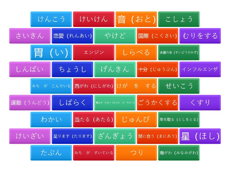 運動(うんどう) - ejercicio, 間に合う(まにあう) - llegar a tiempo, わかい - jóven, けいけん - experiencia, 足ります(たります) - alcanzar, 十分(じゅうぶん) - suficiente, げんきん - dinero en efectivo, けいざい - economía, しばらく - largo tiempo, インフルエンザ - gripe influenza, しんぱい - preocupación, エンジン - motor, こしょう - rotura, しらべる - buscar / investigaar, 音(おと) - sonido, むりをする - hacer un sobreesfuerzo, さいきん - recientemente, ちょうし - estado / funcionamiento, 胃(い) - estómago, ざんぎょう - horas extras, くすり - remedio, 星(ほし) - estrella, 年を取る(としをとる) - envejecer, けが を する - lastimarse, やけど - quemadura, みち が こんでいる - las calles están congestionadas, みち が すいている - las calles están vacias, たぶん - probablemente, つり - pesca, 南がわ(みなみがわ) - lado Sur, 西がわ(にしがわ) - lado Oeste, 気分が わるい(きぶん が わるい) - sentirse mal (físico), 水道の水(すいどうのみず) - agua de red, 国際(こくさい) - internacional, ごうかくする - aprobar, せいこう - éxito, じゅんび - preparativo, 当たる(あたる) - acertar, けんこう - salud, 恋愛(れんあい) - amor,