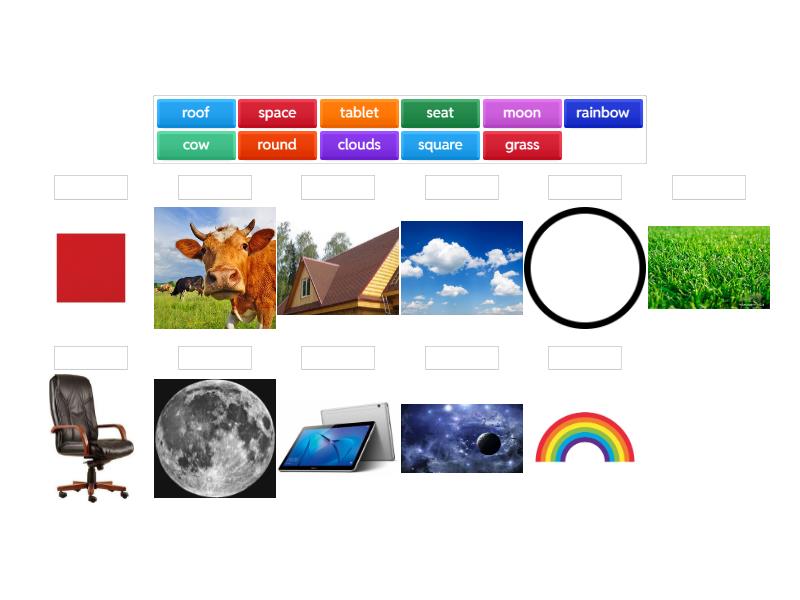 grass, seat, moon, tablet, space, round, square, cow, rainbow, clouds, roof,