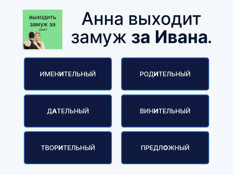 1) Субъект (кто? что?) a) ИМЕНИТЕЛЬНЫЙ b) РОДИТЕЛЬНЫЙ c) ДАТЕЛЬНЫЙ d) ВИНИТЕЛЬНЫЙ e) ТВОРИТЕЛЬНЫЙ f) ПРЕДЛОЖНЫЙ 2) То, что есть (кто/что у Вас есть?) a) ИМЕНИТЕЛЬНЫЙ b) РОДИТЕЛЬНЫЙ c) ДАТЕЛЬНЫЙ d) ВИНИТЕЛЬНЫЙ e) ТВОРИТЕЛЬНЫЙ f) ПРЕДЛОЖНЫЙ 3) То, что нравится / хочется / принадлежит / нужно / вредно / полезно (кто/что?) a) ИМЕНИТЕЛЬНЫЙ b) РОДИТЕЛЬНЫЙ c) ДАТЕЛЬНЫЙ d) ВИНИТЕЛЬНЫЙ e) ТВОРИТЕЛЬНЫЙ f) ПРЕДЛОЖНЫЙ 4) Детерминант (чей?чья?чьё?чьи? / какой?) a) ИМЕНИТЕЛЬНЫЙ b) РОДИТЕЛЬНЫЙ c) ДАТЕЛЬНЫЙ d) ВИНИТЕЛЬНЫЙ e) ТВОРИТЕЛЬНЫЙ f) ПРЕДЛОЖНЫЙ 5) Принадлежность (у кого есть?) a) ИМЕНИТЕЛЬНЫЙ b) РОДИТЕЛЬНЫЙ c) ДАТЕЛЬНЫЙ d) ВИНИТЕЛЬНЫЙ e) ТВОРИТЕЛЬНЫЙ f) ПРЕДЛОЖНЫЙ 6) Отрицание (нет кого? нет чего?) a) ИМЕНИТЕЛЬНЫЙ b) РОДИТЕЛЬНЫЙ c) ДАТЕЛЬНЫЙ d) ВИНИТЕЛЬНЫЙ e) ТВОРИТЕЛЬНЫЙ f) ПРЕДЛОЖНЫЙ 7) Направление движения (откуда? из какого места?) a) ИМЕНИТЕЛЬНЫЙ b) РОДИТЕЛЬНЫЙ c) ДАТЕЛЬНЫЙ d) ВИНИТЕЛЬНЫЙ e) ТВОРИТЕЛЬНЫЙ f) ПРЕДЛОЖНЫЙ 8) Место (человек 📍🧍) (где? у кого?) a) ИМЕНИТЕЛЬНЫЙ b) РОДИТЕЛЬНЫЙ c) ДАТЕЛЬНЫЙ d) ВИНИТЕЛЬНЫЙ e) ТВОРИТЕЛЬНЫЙ f) ПРЕДЛОЖНЫЙ 9) Количество (много, мало, несколько/ 2,3,4 + Р.п. ед.ч./ 5 … + Р.п. мн.ч.) (сколько?) a) ИМЕНИТЕЛЬНЫЙ b) РОДИТЕЛЬНЫЙ c) ДАТЕЛЬНЫЙ d) ВИНИТЕЛЬНЫЙ e) ТВОРИТЕЛЬНЫЙ f) ПРЕДЛОЖНЫЙ 10) Время: полная дата (число+месяц+год) (когда? какого числа?) a) ИМЕНИТЕЛЬНЫЙ b) РОДИТЕЛЬНЫЙ c) ДАТЕЛЬНЫЙ d) ВИНИТЕЛЬНЫЙ e) ТВОРИТЕЛЬНЫЙ f) ПРЕДЛОЖНЫЙ 11) Косвенный объект / Адресат (кому? чему?) a) ИМЕНИТЕЛЬНЫЙ b) РОДИТЕЛЬНЫЙ c) ДАТЕЛЬНЫЙ d) ВИНИТЕЛЬНЫЙ e) ТВОРИТЕЛЬНЫЙ f) ПРЕДЛОЖНЫЙ 12) С глаголами нравиться, хотеться, принадлежать, хватать (кому нравится?) a) ИМЕНИТЕЛЬНЫЙ b) РОДИТЕЛЬНЫЙ c) ДАТЕЛЬНЫЙ d) ВИНИТЕЛЬНЫЙ e) ТВОРИТЕЛЬНЫЙ f) ПРЕДЛОЖНЫЙ 13) С наречиями и глаголами (безличные фразы): мне плохо/ жарко/ трудно/ просто/надо/ нужно / пришлось/ удалось/ (кому?) a) ИМЕНИТЕЛЬНЫЙ b) РОДИТЕЛЬНЫЙ c) ДАТЕЛЬНЫЙ d) ВИНИТЕЛЬНЫЙ e) ТВОРИТЕЛЬНЫЙ f) ПРЕДЛОЖНЫЙ 14) готовиться к экзамену a) ИМЕНИТЕЛЬНЫЙ b) РОДИТЕЛЬНЫЙ c) ДАТЕЛЬНЫЙ d) ВИНИТЕЛЬНЫЙ e) ТВОРИТЕЛЬНЫЙ f) ПРЕДЛОЖНЫЙ 15) Возраст (кому сколько лет?) a) ИМЕНИТЕЛЬНЫЙ b) РОДИТЕЛЬНЫЙ c) ДАТЕЛЬНЫЙ d) ВИНИТЕЛЬНЫЙ e) ТВОРИТЕЛЬНЫЙ f) ПРЕДЛОЖНЫЙ 16) Направление движения (человек ➡️🧍 ) (куда? к кому ты идёшь?) a) ИМЕНИТЕЛЬНЫЙ b) РОДИТЕЛЬНЫЙ c) ДАТЕЛЬНЫЙ d) ВИНИТЕЛЬНЫЙ e) ТВОРИТЕЛЬНЫЙ f) ПРЕДЛОЖНЫЙ 17) Материя, тема (какой? по какому предмету у тебя экзамен?) a) ИМЕНИТЕЛЬНЫЙ b) РОДИТЕЛЬНЫЙ c) ДАТЕЛЬНЫЙ d) ВИНИТЕЛЬНЫЙ e) ТВОРИТЕЛЬНЫЙ f) ПРЕДЛОЖНЫЙ 18) Прямой объект (кого? что?) a) ИМЕНИТЕЛЬНЫЙ b) РОДИТЕЛЬНЫЙ c) ДАТЕЛЬНЫЙ d) ВИНИТЕЛЬНЫЙ e) ТВОРИТЕЛЬНЫЙ f) ПРЕДЛОЖНЫЙ 19) Направление движения (куда?)  a) ИМЕНИТЕЛЬНЫЙ b) РОДИТЕЛЬНЫЙ c) ДАТЕЛЬНЫЙ d) ВИНИТЕЛЬНЫЙ e) ТВОРИТЕЛЬНЫЙ f) ПРЕДЛОЖНЫЙ 20) Время (дни недели) (когда? в какой день?) a) ИМЕНИТЕЛЬНЫЙ b) РОДИТЕЛЬНЫЙ c) ДАТЕЛЬНЫЙ d) ВИНИТЕЛЬНЫЙ e) ТВОРИТЕЛЬНЫЙ f) ПРЕДЛОЖНЫЙ 21) приглашать друга a) ИМЕНИТЕЛЬНЫЙ b) РОДИТЕЛЬНЫЙ c) ДАТЕЛЬНЫЙ d) ВИНИТЕЛЬНЫЙ e) ТВОРИТЕЛЬНЫЙ f) ПРЕДЛОЖНЫЙ 22) поздравлять маму a) ИМЕНИТЕЛЬНЫЙ b) РОДИТЕЛЬНЫЙ c) ДАТЕЛЬНЫЙ d) ВИНИТЕЛЬНЫЙ e) ТВОРИТЕЛЬНЫЙ f) ПРЕДЛОЖНЫЙ 23) видеть картину a) ИМЕНИТЕЛЬНЫЙ b) РОДИТЕЛЬНЫЙ c) ДАТЕЛЬНЫЙ d) ВИНИТЕЛЬНЫЙ e) ТВОРИТЕЛЬНЫЙ f) ПРЕДЛОЖНЫЙ 24) С глаголом звать (как зовут маму?) a) ИМЕНИТЕЛЬНЫЙ b) РОДИТЕЛЬНЫЙ c) ДАТЕЛЬНЫЙ d) ВИНИТЕЛЬНЫЙ e) ТВОРИТЕЛЬНЫЙ f) ПРЕДЛОЖНЫЙ 25) Период времени (на какое время? на сколько? как долго? за сколько времени?) a) ИМЕНИТЕЛЬНЫЙ b) РОДИТЕЛЬНЫЙ c) ДАТЕЛЬНЫЙ d) ВИНИТЕЛЬНЫЙ e) ТВОРИТЕЛЬНЫЙ f) ПРЕДЛОЖНЫЙ 26) Инструмент (чем?) a) ИМЕНИТЕЛЬНЫЙ b) РОДИТЕЛЬНЫЙ c) ДАТЕЛЬНЫЙ