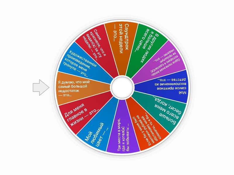 1) Художественное произведение, которое меня тронуло — это... 2) Самое красивое, что я видел(а) за эту неделю — это... 3) Саундтрек этой недели — это... 4) В других людях я больше всего ценю... 5) Одна полезная вещь, которую я сделал(а) за прошлую неделю — это... 6) Моё самое приятное воспоминание из детства — это... 7) Больше всего меня бесит, когда... 8) Если бы у меня был миллион рублей на обстановку моей комнаты, то я бы... 9) Три места в мире, где я хотел(а) бы побывать: ... 10) Мой любимый цвет — ... 11) Для меня главное в жизни — это... 12) Я думаю, что мой самый большой недостаток — это...