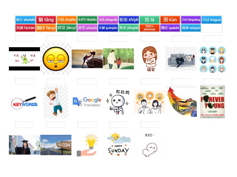 职业 zhíyè, 发展 fāzhǎn, 建议 jiànyì, 困 kùn, 躺 tǎng, 将来 jiānglái, 关键 guānjiàn, 优秀 yōuxiù, 硕士 shuòshì, 确实 quèshí, 兴奋 xīngfèn, 拉 lā, 翻译 fānyì, 礼拜天  lǐbàitiān , 母亲 mǔqīn , 不过 búguò, 有空儿 yǒukòngr , 永远 yǒngyuǎn, 方向 fāngxiàng,