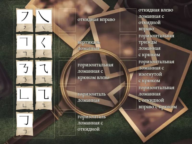 一 - горизонтальная, 丨 - вертикальная, 丿 - откидная влево, ㇏ - откидная вправо, 丶 - точка, ㇀ - восходящая, 乛 - горизонталь с крюком, 亅 - вертикаль с крюком влево, 𠄌 - вертикаль с крюком вправо, ㇁ - вертикальная изогнутая с крюком, ㇂ - наклонная вправо с крюком, ㇃ - лежащая изогнутая с крюком, 𠃍 - горизонталь ломанная, 𠃊 - вертикаль ломанная, ㇇ - горизонталь ломанная с откидной, 𠃋 - откидная ломанная с горизонтальной, 𡿨 - откидная влево ломанная с откидной вправо, ㇋ - горизонталь дважды ломанная с откидной, 𠃌 - горизонтальная ломанная с крюком влево, ㇊ - горизонтальная ломанная с крюком вправо, ㇉ - вертикальная дважды ломанная с крюком, 𠄎 - горизонтальная трижды ломанная с крюком, ㇌ - горизонтальная с откидной влево и изогнутой с крюком, ⺄ - горизонтальная ломанная с откидной вправо с крюком , 乚 - вертикальная ломанная с изогнутой с крюком, ㇈ - горизонтальная ломанная с изогнутой с крюком, ㄣ - вертикальная ломанная с откидной влево,