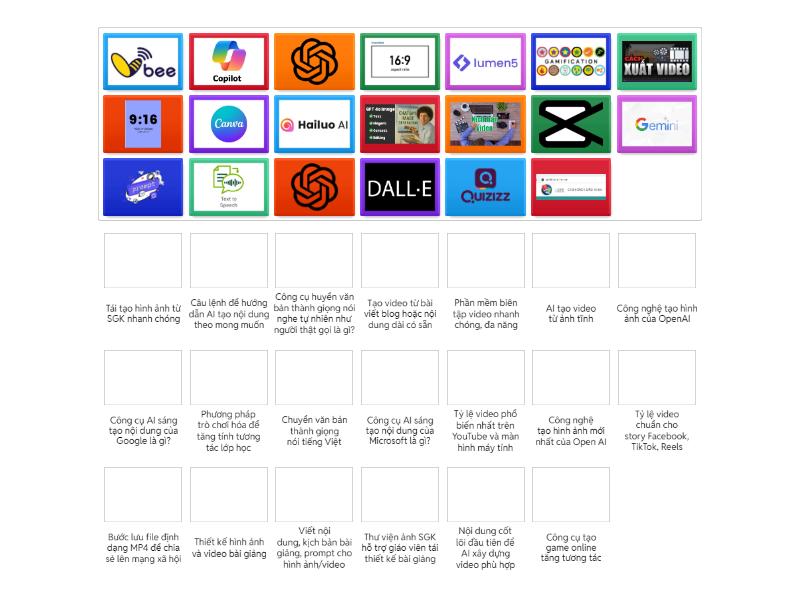Công nghệ tạo hình ảnh của OpenAI, Thiết kế hình ảnh và video bài giảng, Viết nội dung, kịch bản bài giảng, prompt cho hình ảnh/video, Chuyển văn bản thành giọng nói tiếng Việt, Tạo video từ bài viết blog hoặc nội dung dài có sẵn, Tỷ lệ video chuẩn cho story Facebook, TikTok, Reels, Tỷ lệ video phổ biến nhất trên YouTube và màn hình máy tính, Thư viện ảnh SGK hỗ trợ giáo viên tái thiết kế bài giảng, Câu lệnh để hướng dẫn AI tạo nội dung theo mong muốn, Công cụ huyển văn bản thành giọng nói nghe tự nhiên như người thật gọi là gì?, Phương pháp trò chơi hóa để tăng tính tương tác lớp học, Nội dung cốt lõi đầu tiên để AI xây dựng video phù hợp, Bước lưu file định dạng MP4 để chia sẻ lên mạng xã hội, Công nghệ tạo hình ảnh mới nhất của Open AI, Công cụ tạo game online tăng tương tác, AI tạo video từ ảnh tĩnh, Tái tạo hình ảnh từ SGK nhanh chóng, Công cụ AI sáng tạo nội dung của Microsoft là gì?, Công cụ AI sáng tạo nội dung của Google là gì?, Phần mềm biên tập video nhanh chóng, đa năng,