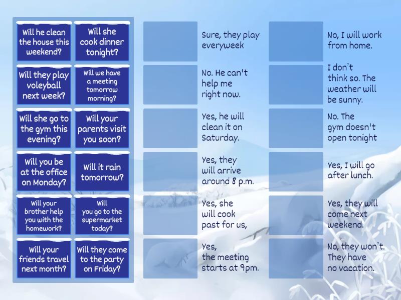 Will you go to the supermarket today? - Yes, I will go after lunch., Will she cook dinner tonight? - Yes, she will cook past for us,, Will they come to the party on Friday? - Yes, they will arrive around 8 p.m., Will your brother help you with the homework? - No. He can't help me right now., Will we have a meeting tomorrow morning? - Yes, the meeting starts at 9pm., Will he clean the house this weekend? - Yes, he will clean it on Saturday., Will your friends travel next month? - No, they won’t. They have no vacation., Will she go to the gym this evening? - No. The gym doesn't open tonight, Will it rain tomorrow? - I don’t think so. The weather will be sunny., Will your parents visit you soon? - Yes, they will come next weekend., Will you be at the office on Monday? - No, I will work from home., Will they play voleyball next week? - Sure, they play everyweek,