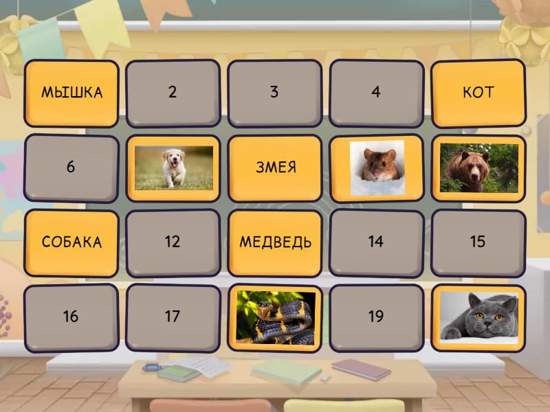 КОТ, СОБАКА, МЫШКА, ЗМЕЯ, МЕДВЕДЬ, КОЗА, ПТИЧКА, РЫБА, ОБЕЗЬЯНА, БЕЛКА,