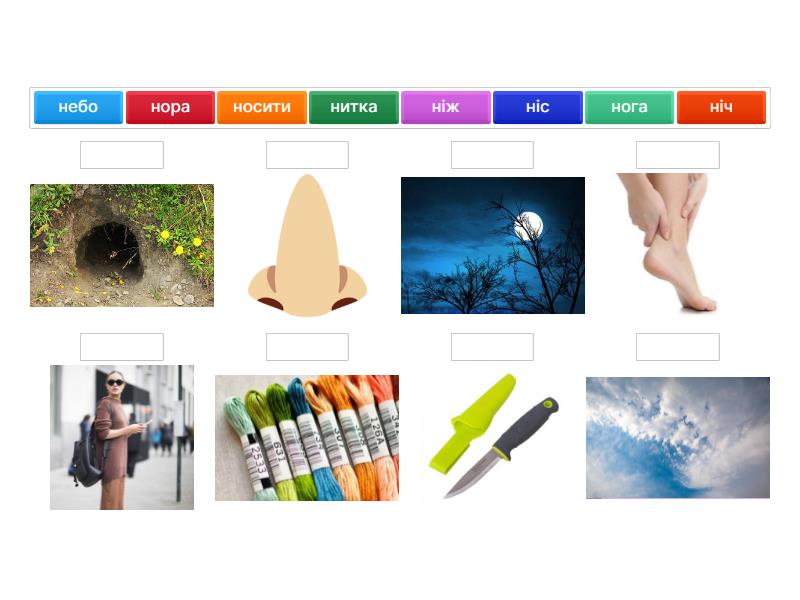 ніс  , ніч , нога , ніж  , нитка , небо , нора  , носити,