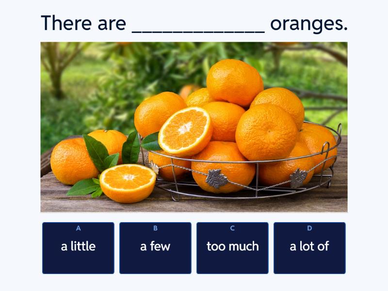 1) There are _____________ oranges. a) a little b) a few c) too much d) a lot of 2) There isn't ____________ cheese. a) much b) a little c) too many d) many 3) There's _____________ bread. a) much b) a few c) a little d) lot of 4) There's ________________ olive oil. a) a few b) a little c) a lot of d) too many 5) There isn't ____________ butter. a) many b) much c) any d) a few 6) I need _______________ tomatoes. a) a little b) a few c) no d) too much 7) There's _______ food in the fridge. a) no b) any c) some d) too much 8) Is there _______ milk left? a) no b) some c) too d) any 9) There are _________ plates for everyone. There are four plates and there are four of us. a) not enough b) enough c) too many d) too much 10) The coffee is _______ cold, I'll make some new. a) enough b) not enough c) too d) too much