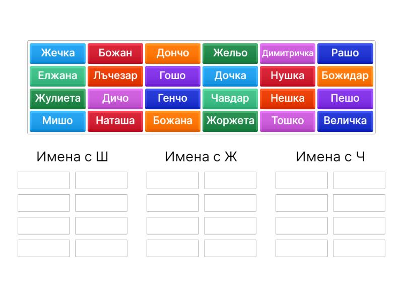 Имена с Ш: Гошо, Мишо, Наташа, Тошко, Пешо, Нешка, Рашо, Нушка, Имена с Ж: Божана, Божидар, Жулиета, Божан, Елжана, Жоржета, Жельо, Жечка, Имена с Ч: Чавдар, Величка, Генчо, Дончо, Лъчезар, Димитричка, Дичо, Дочка,