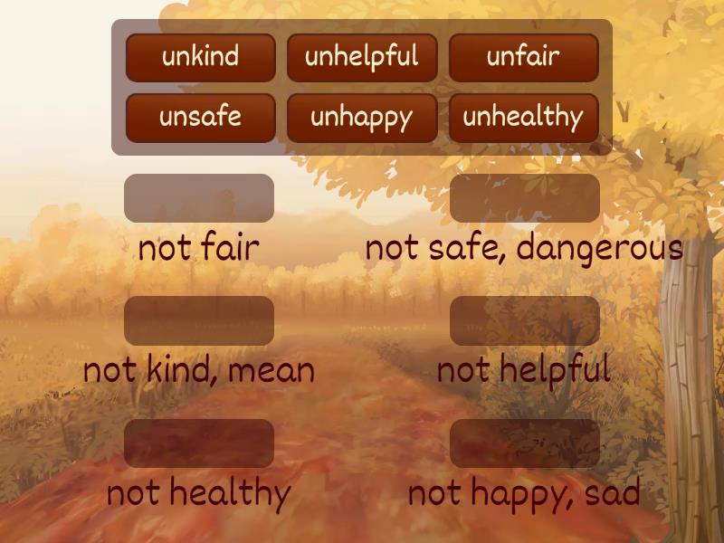 unkind - not kind, mean, unhelpful - not helpful, unhappy - not happy, sad, unsafe - not safe, dangerous, unfair - not fair, unhealthy - not healthy,