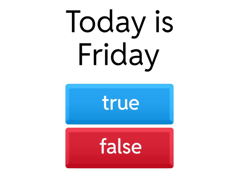 1) Today is Friday a) true b) false 2) Today is Thursday a) true b) false 3) Chips are sweet a) true b) false 4) Chocolate is salty a) true b) false 5) In the morning we have breakfast a) true b) false 6) In the evening we have lunch a) true b) false 7) Biscuits are sweet a) true b) false